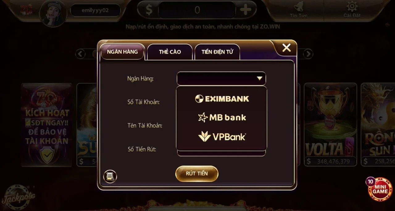 Đây là ưu điểm nổi trội nhất của Zowin. Quy trình nạp rút hiện được tự động hóa 100% qua API, loại bỏ sai sót và đảm bảo tiền về đúng tài khoản. Bạn có thể các hình thức nạp/rút tiện lợi cho bản thân như: Ngân hàng (VP Bank, Techcombank, Vietcombank,…); Tiền điện tử: USDT (TRC20); Thẻ cào hỗ trợ 4 nhà mạng lớn (Viettel, Vinaphone, Mobifone, Vietnamobile).