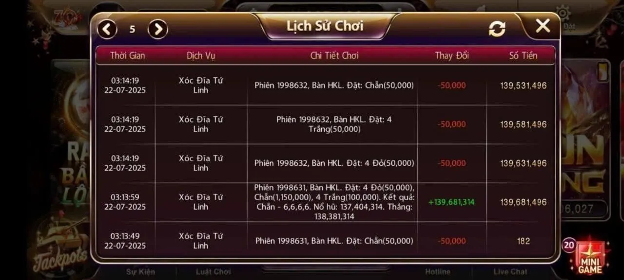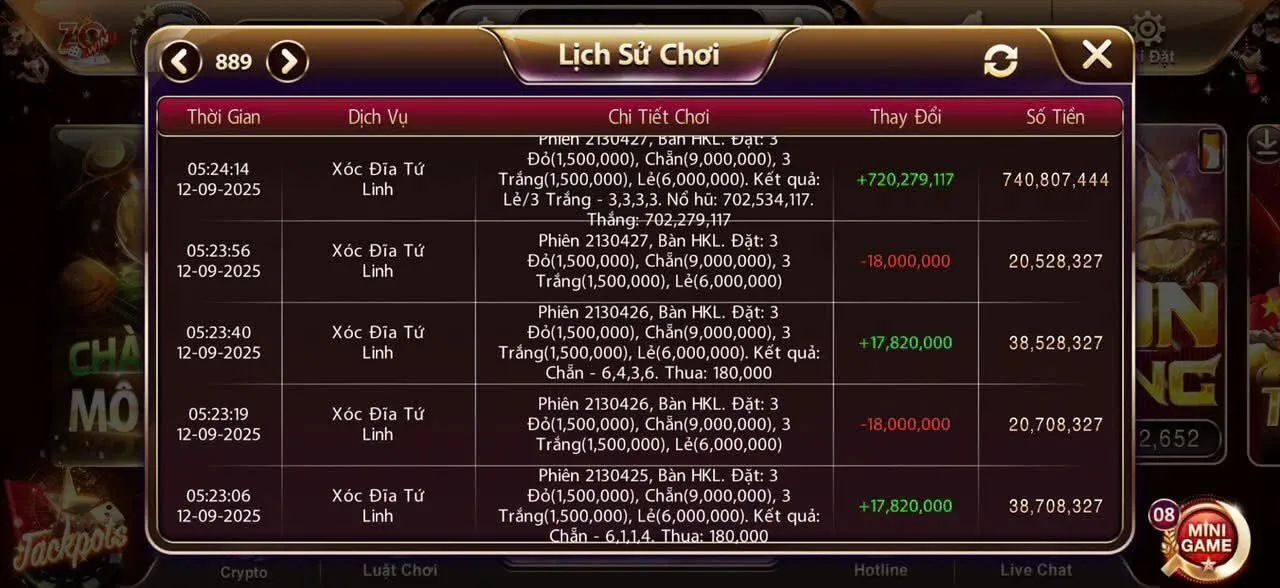 Dưới đây là những hình ảnh ghi lại những chiến thắng lớn của người chơi Zowin. Từ xóc đĩa, nổ hũ jackpot, tài xỉu ăn liên tiếp đến live casino thắng đậm – tất cả đều là màn hình thật từ người chơi Việt Nam.