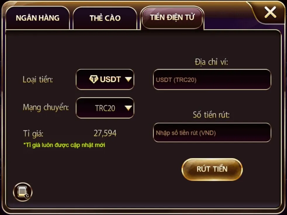 Đây là bước quan trọng nhất. Bạn hãy làm lệnh rút về Ngân hàng hoặc Ví điện tử, Nhập chính xác thông tin của bạn (phải trùng tên đăng ký).