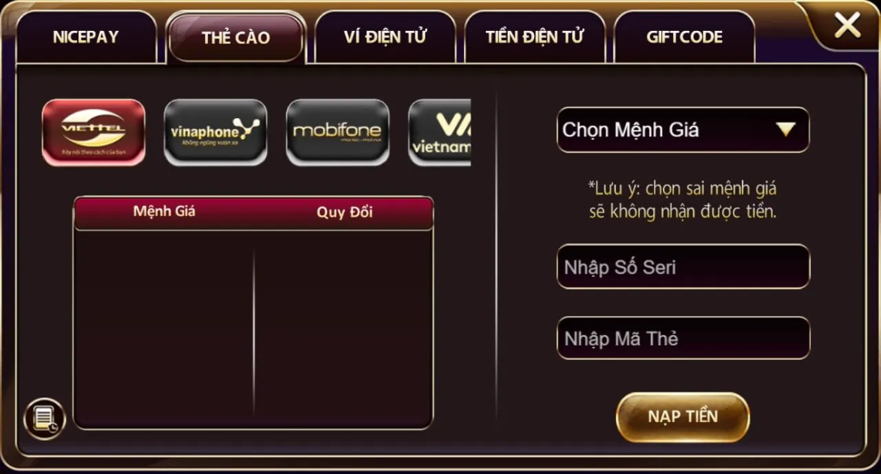 Chọn mục Nạp Tiền -> Chọn Thẻ Cào hoặc Ví điện tử. Bạn nạp thử 100k để kiểm tra tốc độ vào tiền. Thông thường tiền sẽ “ting ting” trong tài khoản game của bạn chỉ sau 60 giây.