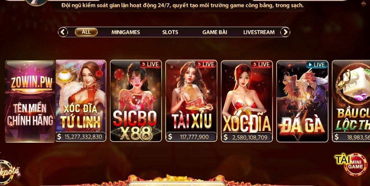 Zo Win cung cấp đa dạng các trò chơi bài hấp dẫn, được thiết kế theo tiêu chuẩn quốc tế. Bạn có thể lựa chọn sảnh game bất kỳ phù hợp với sở thích và khả năng của mình, như: Game bài (Poker, Mậu Binh, Tiến Lên Miền Nam…); Minigame (Tài xỉu, Dragon, Trên Dưới…); Slots – Nổ hũ (Thủy Cung, Thần Tài, Ông Đồ…); Live Stream (Xóc Đĩa, Đá Gà, Sicbo,…)